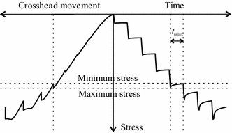 where σ(t) was determined as ratio between compression force at time t (0 ≤ t ≤ trelax) and initial cross-sectional area (A) of a specimen. ‘Maximum stress’ denoted the absolute value of the stress just before the beginning of each relaxation period. Figure 1 shows stress development and crosshead movement with time in stepwise deformation-controlled (crosshead movement) experiments for wood under compression.