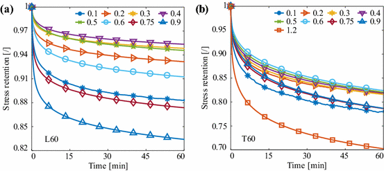 Figure 2 shows stress retention curves for trelax = 60 min under applied stepwise deformation in (a) L and (b) T directions. The presented stress retention curves are determined as average among the specimens in groups L60 and T60. Stress retention is a nonlinear function of time at all deformation levels. Magnitude of the stress retention curves varies with the applied deformation levels. The shape of stress retention curves over time for specimens in groups L5 and T5 is very similar to those in Fig. 2a, b, respectively.