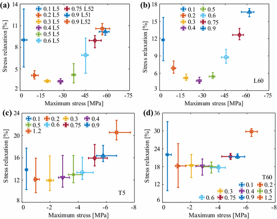 Figure 3 depicts stress relaxation at the end of each relaxation period in relation to maximum stress reached just before the start of each relaxation period for all tested groups. Markers designate mean value and bars designate minimum and maximum values of depicted variables. Mean values of stress relaxation plotted in relation to maximum stresses for the applied deformation levels show a convex function formation. First, stress relaxation decreases to a certain deformation level, where the trend turns and stress relaxation starts increasing. Meanwhile, the maximum stress is monotonically increasing. Obviously, the material behaves differently under low deformation than under high deformation. Probably, the change in material’s behavior appears in the transition from recoverable to permanent deformation. In the range of recoverable elastic deformation, each additional deformation step decreases the stress relaxation, while in the range of irrecoverable plastic deformation the opposite trend is observed, which is in agreement with the experimental results of stress relaxation in compression reported by Echeniques-Manrique (1969). For specimens deformed in L direction (Fig. 3a, b), the elastic limit is reached between deformation levels 0.4 and 0.5 mm. The results in Fig. 3c, d indicate the limit of elasticity is between deformation levels 0.3 and 0.4 mm for specimens in group T5 and between 0.6 and 0.75 mm for group T60. In general, the difference in mean values of stress relaxation decreases the closer to the limit of elasticity the material is deformed. The variation of mean value of stress relaxation is about 2% for deformation levels 0.3–0.5 mm.