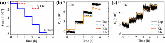 a Strain input in the direction of applied deformation in numerical models for groups L60 and T60; measured (Exp) and calculated (K, KD, KK models) strain perpendicular to the applied deformation for groups b L60 and c T60