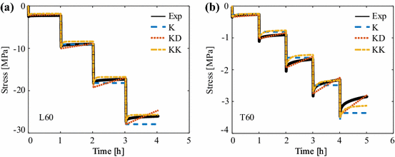 Experimental (Exp) and numerically predicted (K, KD, KK) stress–time curves for applied deformation in a longitudinal (L60) and b transverse directions (T60) simultaneously