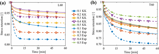 Stress retention curves determined from experimental data (Exp) and predicted by the linear viscoelastic model (KK, dashed lines) for consecutive deformation steps in a longitudinal (L60) and b transverse directions (T60) simultaneously