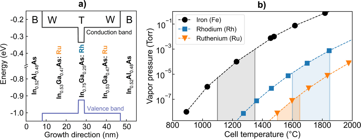 (a) Schematic band diagram of a QPC quantum well, consisting of an Rh-doped trapping layer (T), Ru-doped well layers (W), and nominally undoped barrier layers (B). (b) Vapor pressures for the elements Fe, Rh, and Ru as a function of MBE cell temperature based on the work presented in Ref. [27]. The Ru-cell temperatures used in this work range from 1500 °C to 1650 °C, as indicated by the orange area, which results in relatively low Ru vapor pressures between 7 × 10−9 Torr and 2 × 10−7 Torr. For comparison, the typical temperature ranges of Fe and Rh cells used for the growth of photoconductors are indicated by the gray and blue areas, respectively