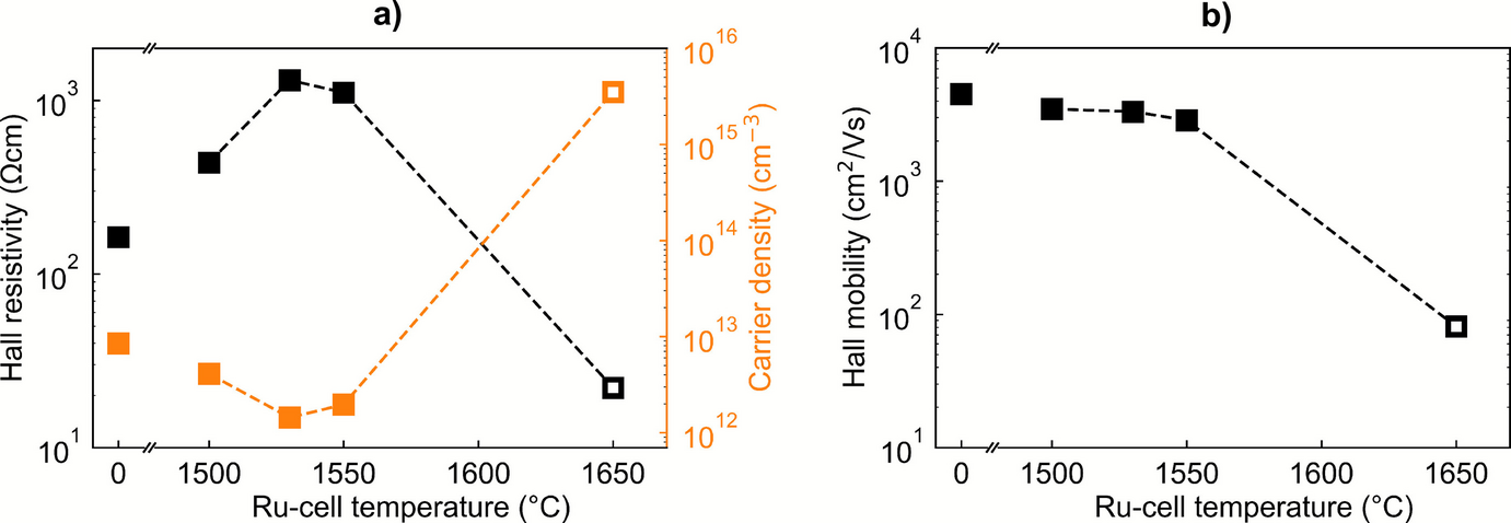 Hall effect measurement data of QPC samples co-doped with Rh and Ru as a function of Ru-cell temperature, showing the (a) Hall resistivity (black squares) and carrier density (orange squares) and (b) Hall mobility. Filled squares indicate n-type conductivity, and open squares p-type conductivity. A high resistivity > 1000 Ωcm and a very low free electron concentration ≤ 2.0 × 1012 cm−3 are achieved for Ru-cell temperatures of 1530 °C and 1550 °C. An excellent carrier mobility > 2800 cm2/Vs is maintained for Ru-cell temperatures up to 1550 °C