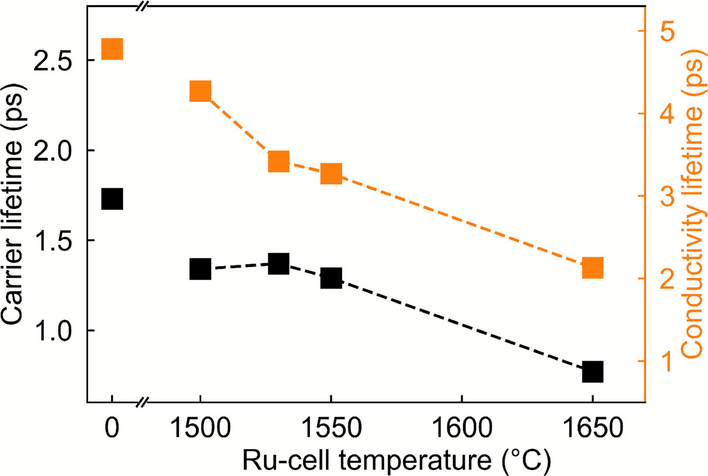 The conductivity lifetime τOPTP exhibits a similar trend, decreasing from 4.70 to 4.27, 3.42, and 3.27 ps, i.e., by a maximum of 32% for the samples grown at TRu ≤ 1550 °C, and more significantly to 2.13 ps, i.e., by 55% for the sample grown at TRu = 1650 °C. Thus, although the conductivity lifetime is considerably longer (by an average factor of 2.7 at this pump fluence), it is clearly correlated with the carrier lifetime.