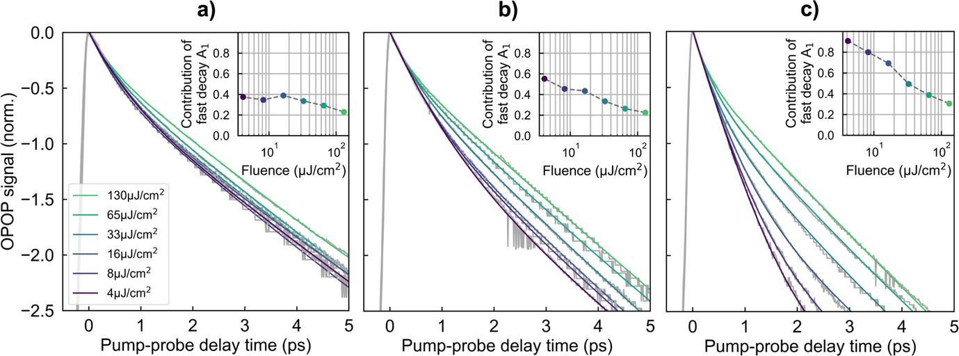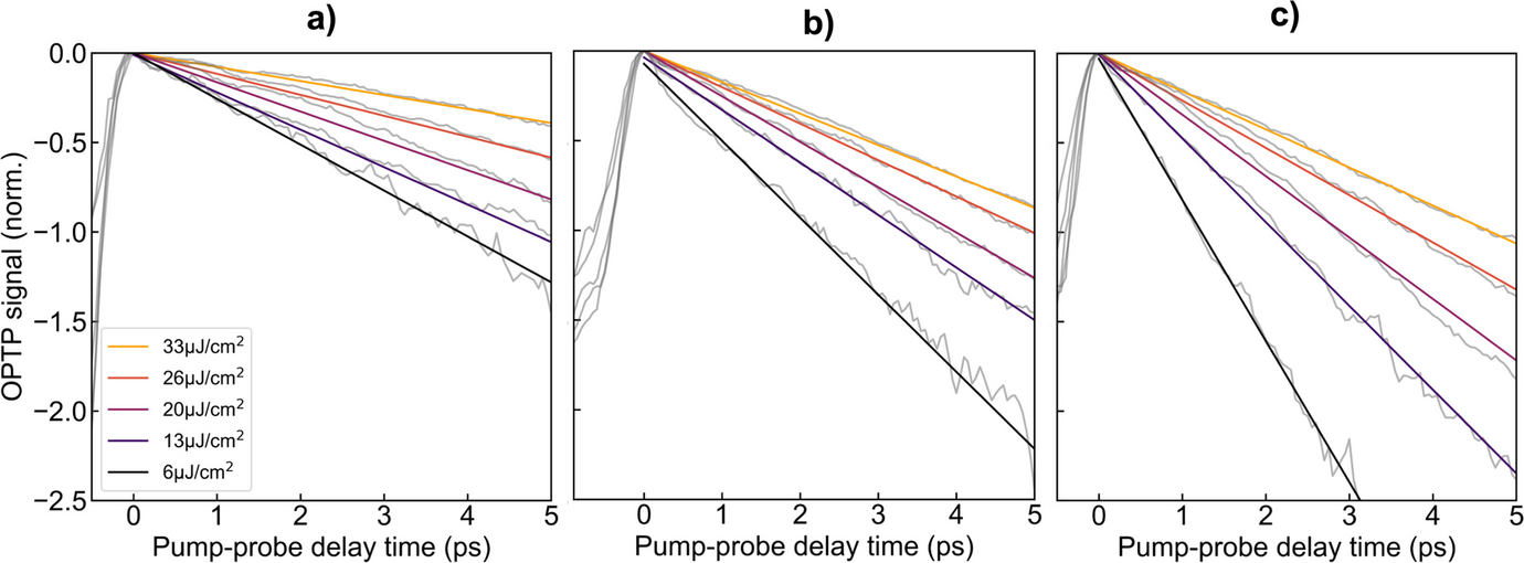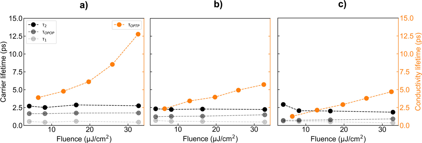 Figure 5a–c show the photoconductivity decay curves as measured by OPTP at different pump fluences of 6 to 33 µJ/cm2. The transients were fitted with a mono-exponential function to determine the photoconductivity lifetime τOPTP. Note that the fitting was limited to a pump-probe delay time of 7.5 ps after photoexcitation to avoid the secondary rise of photoconductivity caused by back-reflection of the pump pulse at the substrate backside.