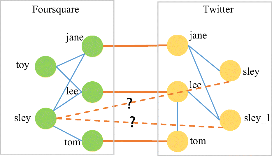 An example of User Identity Linkage. The blue link represents friend relation in social network, and orange line represents matched identity pair. User identity sley (in Foursquare) has two candidate identities in Twitter: sley and sley_1. If considering previously matched information, sley in Foursquare is similar to sley_1 in Twitter because they share more similarity friends