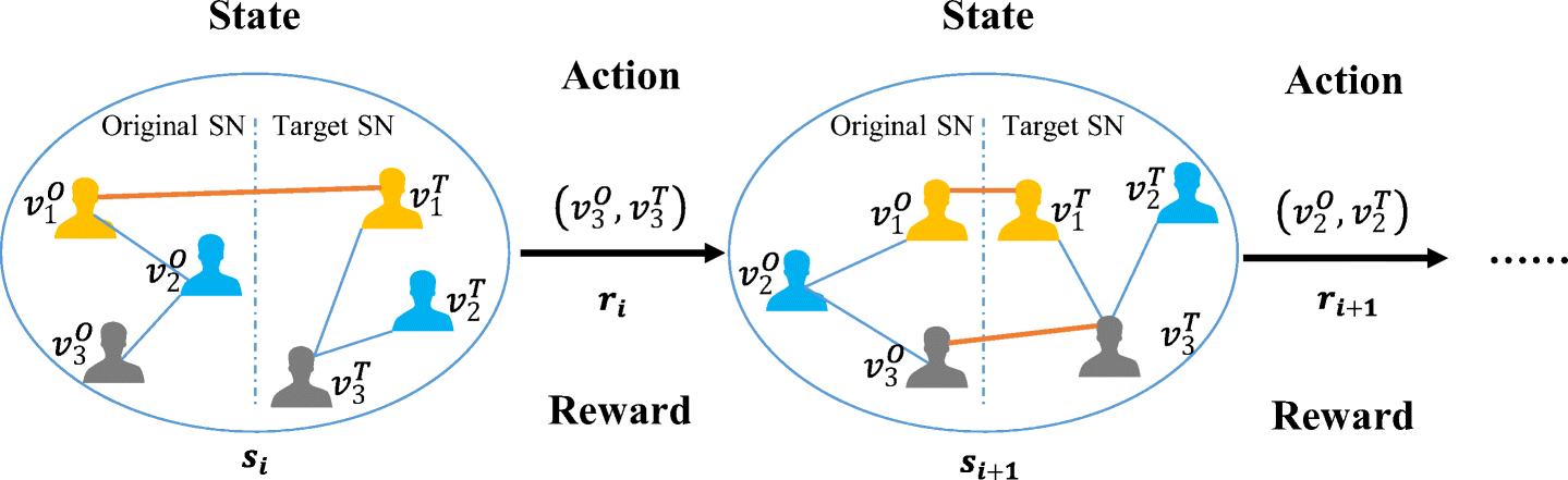 The Procedure of the proposed RLink of Reinforcement Learning based User Identity Linkage. The blue link represents friend relation in social network, and orange line at state Si represents matched identity pair. At time i, agent generates a pair of matching identities as an action according to current state. After agent performs this action, the state would be changed at time i + 1 and next action can be generated based on Si+ 1