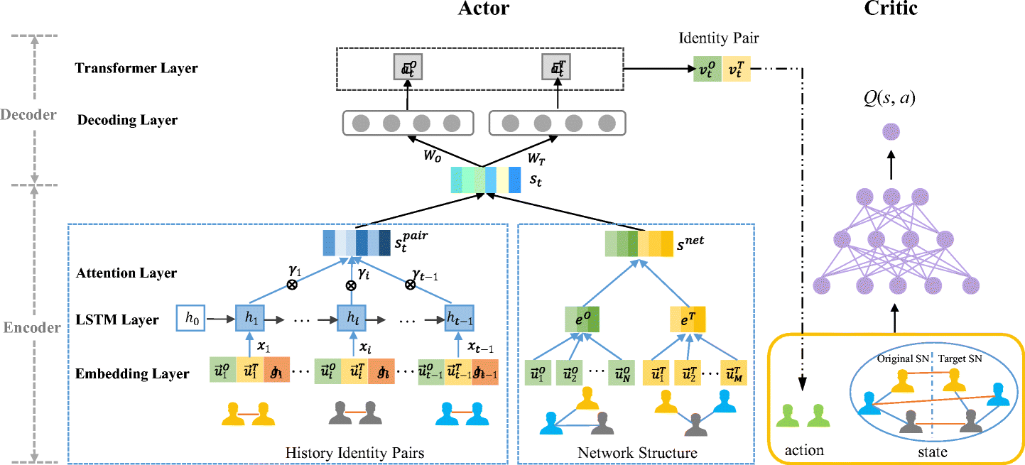 The framework of Actor-Critic network, where the actor is comprised of an Encoder-Decoder architecture and the critic is DQN. The inputs of Actor are history identity pairs and network structure, where history identity pairs were generated by our Actor-Critic network before current epoch (See (4)). Remarkably, h0 is a zero vector. Then this action and current state are input onto the Critic to evaluate the quality of this action