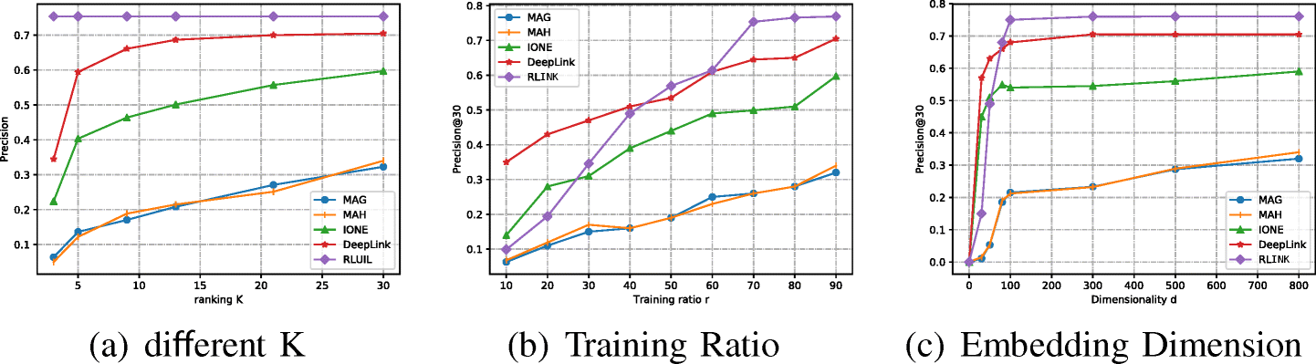 In this section, we compare our RLink with the state-of-the-art methods on user identity linkage task.