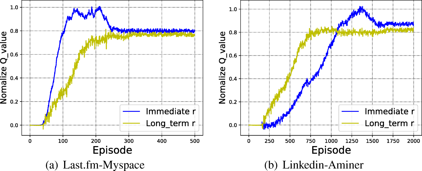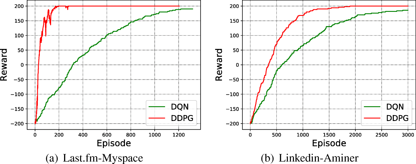 Recently, because of various advantages of RL, RL has been successfully applied in many fields, such as Game [16, 30], Computer Vision [44] and Natural Language Processing [5]. However, due to the complexity of online social network analysis tasks, works based on RL are less than in other fields. [31] is an early work based on reinforcement learning in social network which argues modeling network structure as dynamic increases realism without rendering the problem of analysis intractable. Existing methods utilize DQN or Q-learning framework, such as [11] applies DQN to address Graph Pattern Matching problem and [26] applies Q-Learning to search expert in social network. Inspired by the above works, we consider UIL as a markov decision problem and apply the reinforcement learning framework. However, computing Q-value of each identity pair is time-consuming. So, we adapt Actor-Critic framework to address UIL in this paper.