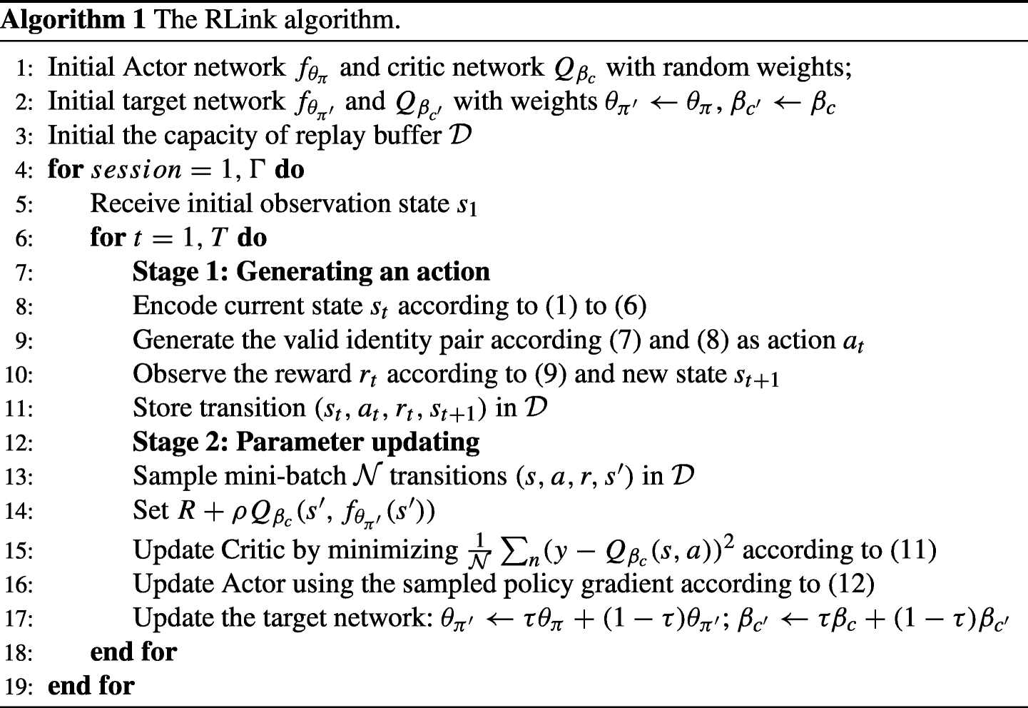 The training algorithm for the proposed framework RLink is presented in Algorithm 1. In each iteration, there are two stages, i.e., 1) generating an action (lines 8-11), and 2) parameter updating (lines 13-17). For generating an action, given the current state st, the agent firstly encode current state as a vector (line 8) and then generate a pair of nodes according to this vector (line 9); then the agent observes the reward rt and update state to st+ 1 (line 10); finally the agent stores transitions (st,at,rt,s(t + 1)) into replay buffer \(\mathcal {D}\). For the parameter updating stage: the agent samples mini-batch of transitions \((s,a,r,s^{\prime })\) from \(\mathcal {D}\) (line 13), and then updates parameters of Actor and Critic following a standard DDPG procedure (lines 14-16). Finally, the parameters of target network \(\beta _{c^{\prime }}\) and \(\theta _{\pi ^{\prime }}\) are updated via the soft update way (line 17).