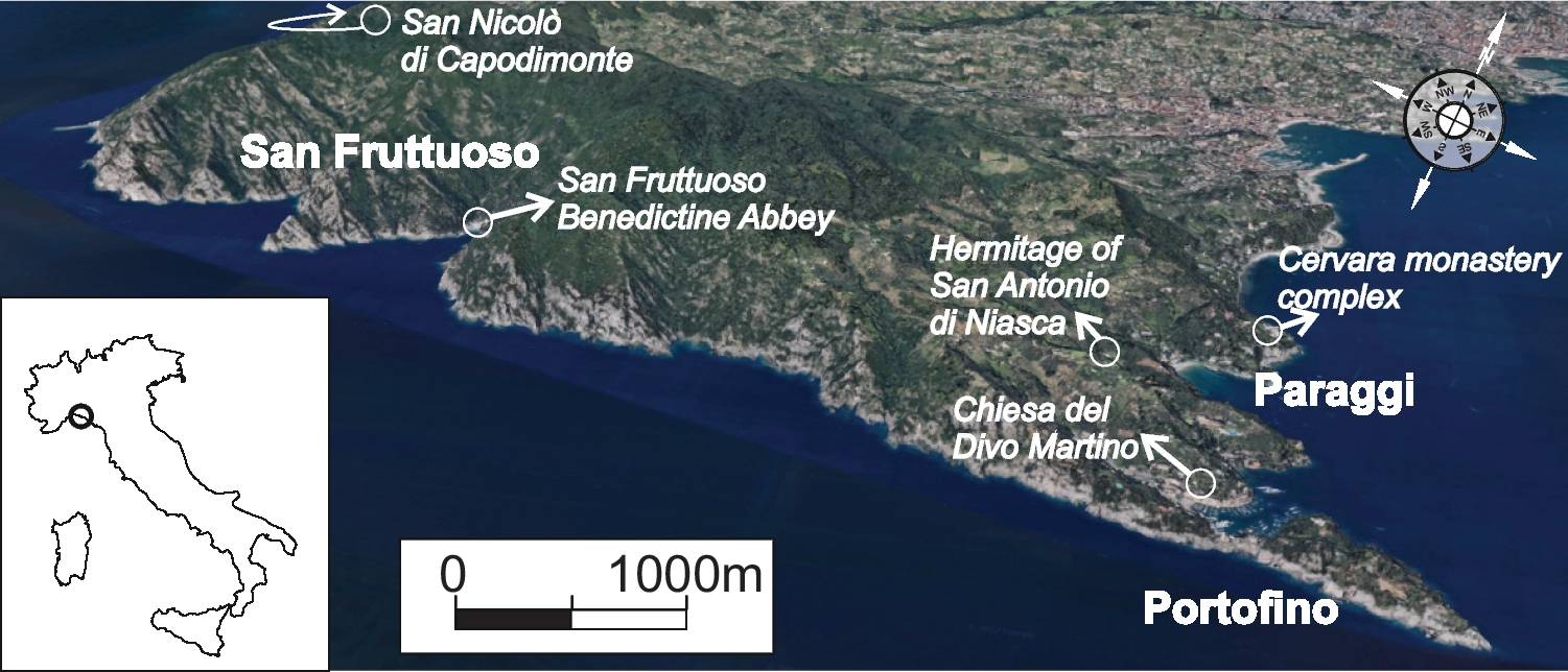 The entire promontory is also extraordinarily rich in cultural heritage, not only represented by the seaside towns of Camogli and Portofino, but above all linked to the ancient medieval religious trails that connected various monastic centers (Figs. 1 and 3): on the western side, there is the Church of San Nicolò di Capodimonte (Fig. 2a), dating back to the twelfth century; in San Fruttuoso, there is the Benedictine abbey (Fig. 2b) dating back to the tenth to eleventh century; and on the eastern side, there is the Cervara monastery complex (Fig. 2c), built in 1361 and maintained by Benedictine monks. Other important buildings of great cultural interest are the Hermitage of S. Antonio di Niasca and the Church of Divo Martino in Portofino (Figs. 1 and 3).
