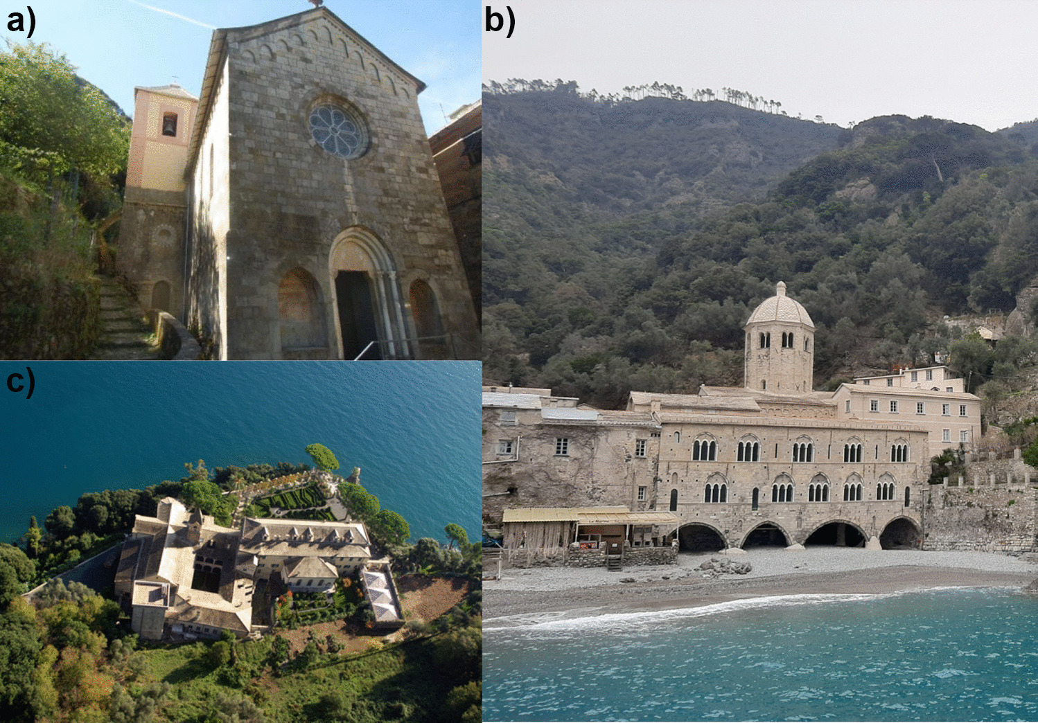 Some examples of Portofino’s cultural heritage: a Church of San Nicolò di Capodimonte; b San Fruttuoso Benedictine abbey; c Cervara monastery complex