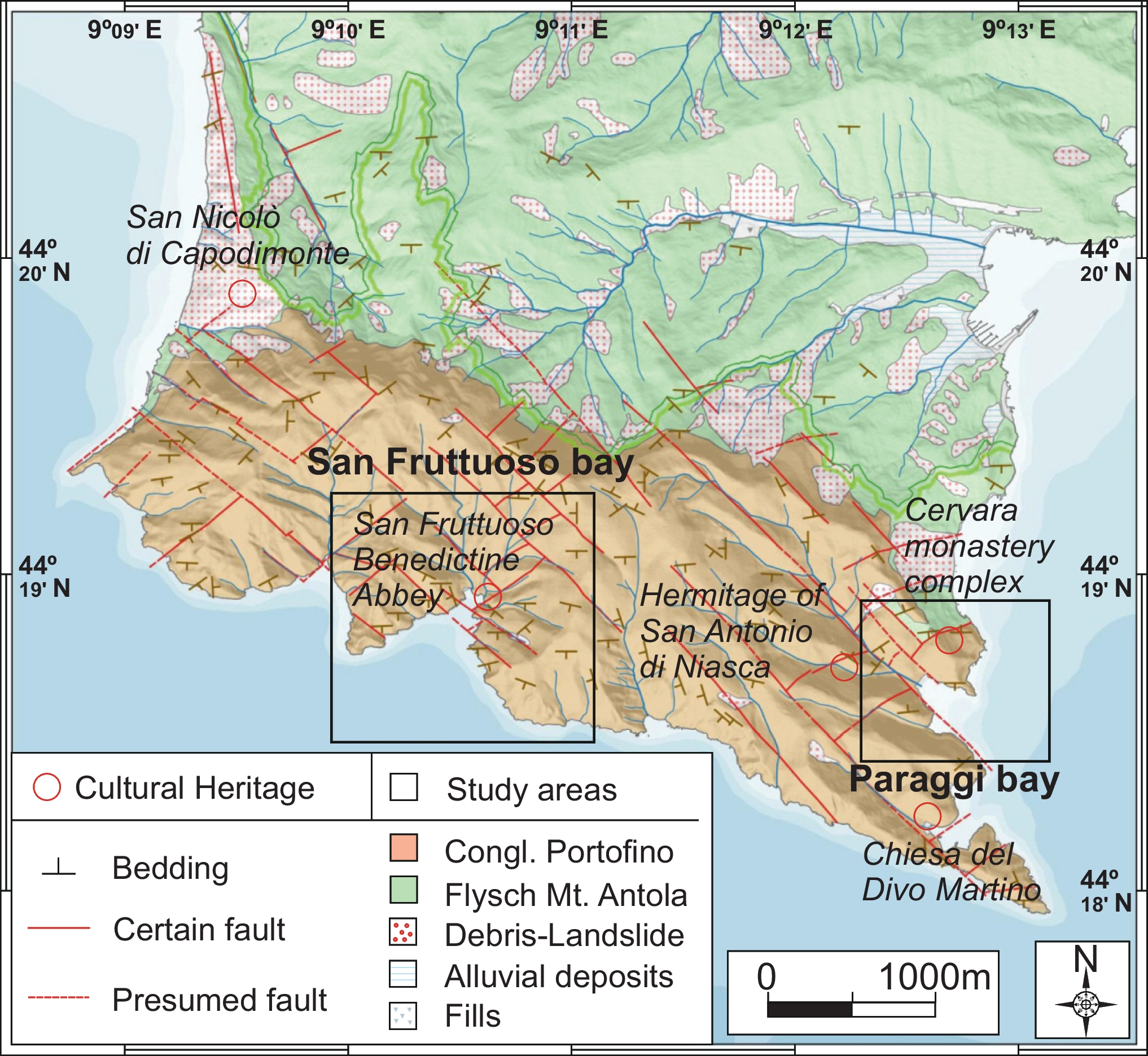 The investigated area of Portofino Natural Park covers a wide natural and cultural area where it is possible to visit remarkable heritage sites walking in an incredible high-value landscape. The entire area is characterized by the presence of conglomerate rocks. The geological and geo-mechanical characteristics of this formation affect the potential instability of the natural and cultural heritages sites, especially during heavy rainfall and extreme events.