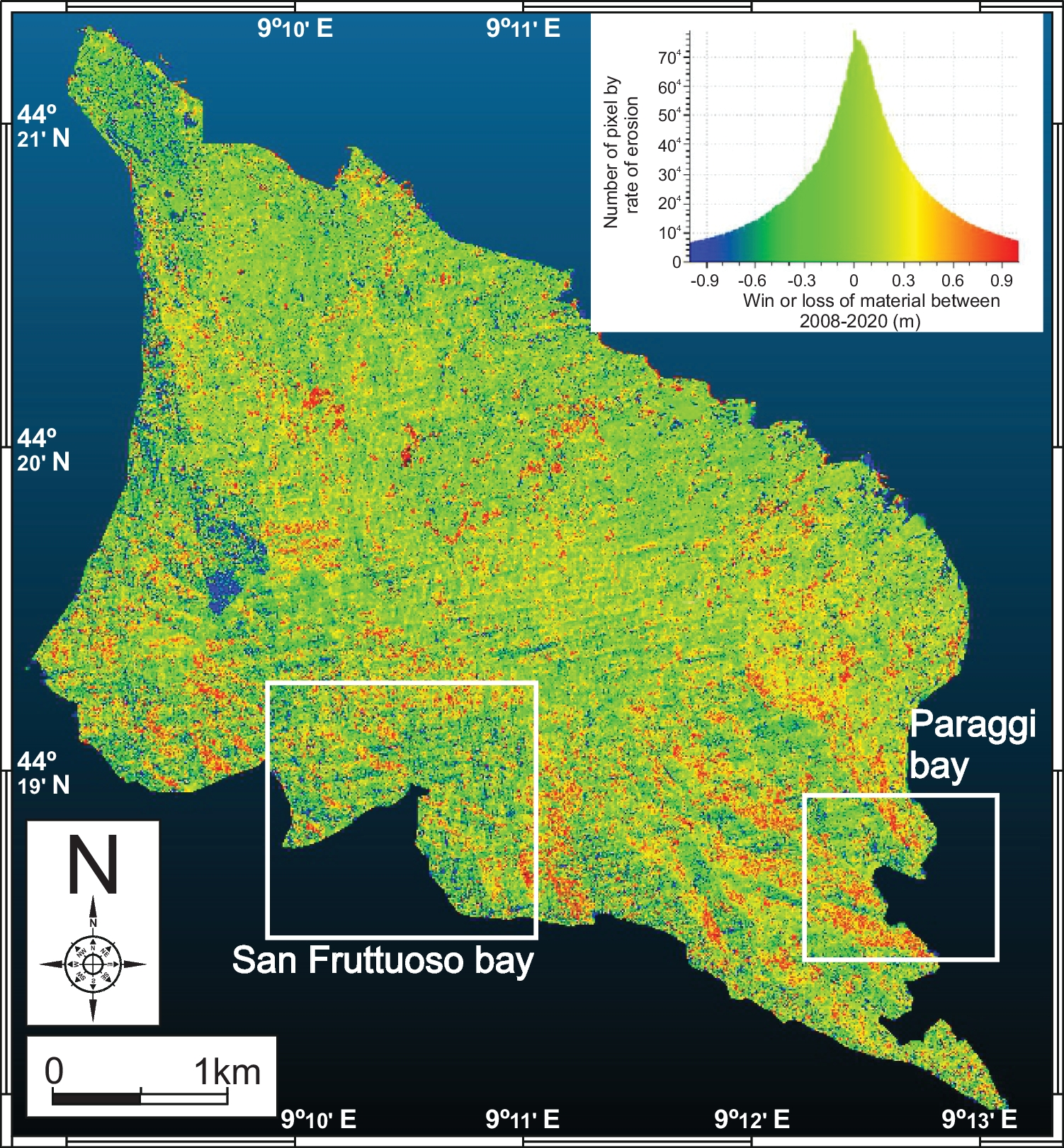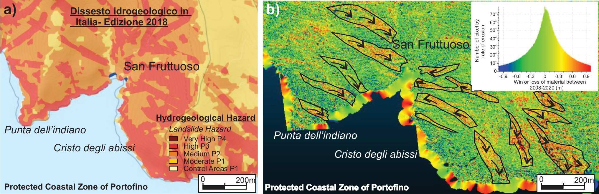 This comparison makes it possible to identify that the study area is relatively stable from the viewpoint of slope stability and erosion, since differences close to zero (green color) predominate throughout the sector. However, significant differences can be identified between the northern area, with less evolution, and the southern area, where significant settlements of around 1 m (blue color) and raise of up to 1 m (red color) can be identified. Often, especially remarkable in San Fruttuoso, these zones of gain or losses of terrain elevation are aligned to NW–SE orientation (structural patterns that control hydrographic network evolution) that fits with the ground movements highlighted by the ISPRA (2018) in the “Dissesto idrogeologico in Italia: pericolosità e indicatori di rischio – Edizione 2018”, where the landslide hazard of the area under study was collected (Fig. 5).