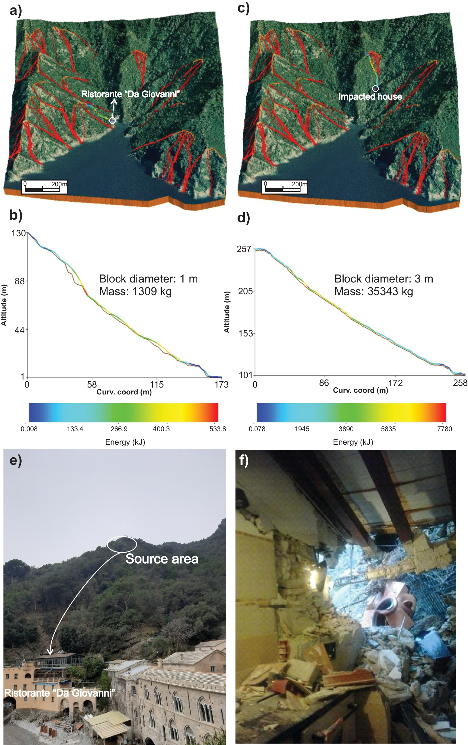 For the definition of the source areas, it is essential to carry out fieldwork to identify and locate exactly the origin of the rockfalls, evaluating scars in the rock mass (Palmstrom 2005; Corominas et al. 2017), which will then be reflected in the models. Regarding the volume of blocks, in the absence of a specific inventory of rockfalls, priority has been given to the study of spherical blocks of 1-m diameter, which is the largest size recorded in the area during the fieldwork and, therefore, the one with the highest energy (Corominas et al. 2017; Morales et al. 2021). In our case, a rigid body approach was used for the modeling. In order to calibrate the input parameters of the modeling, the first step has been to carry out a recent papers review of several authors working in different terrains (Ji et al. 2020, 2021; Tang et al. 2021; Ye et al. 2021; Prades-Valls et al. 2022; Sardana et al. 2022; Shadabfar et al. 2022), with the aim of framing each of those defined in San Fruttuoso and Paraggi within established limits. From this starting point, rebound values were calibrated via 3D back analysis to achieve the best agreement between observations and modeling estimates (Sarro et al. 2018; Fanos and Pradhan 2019).