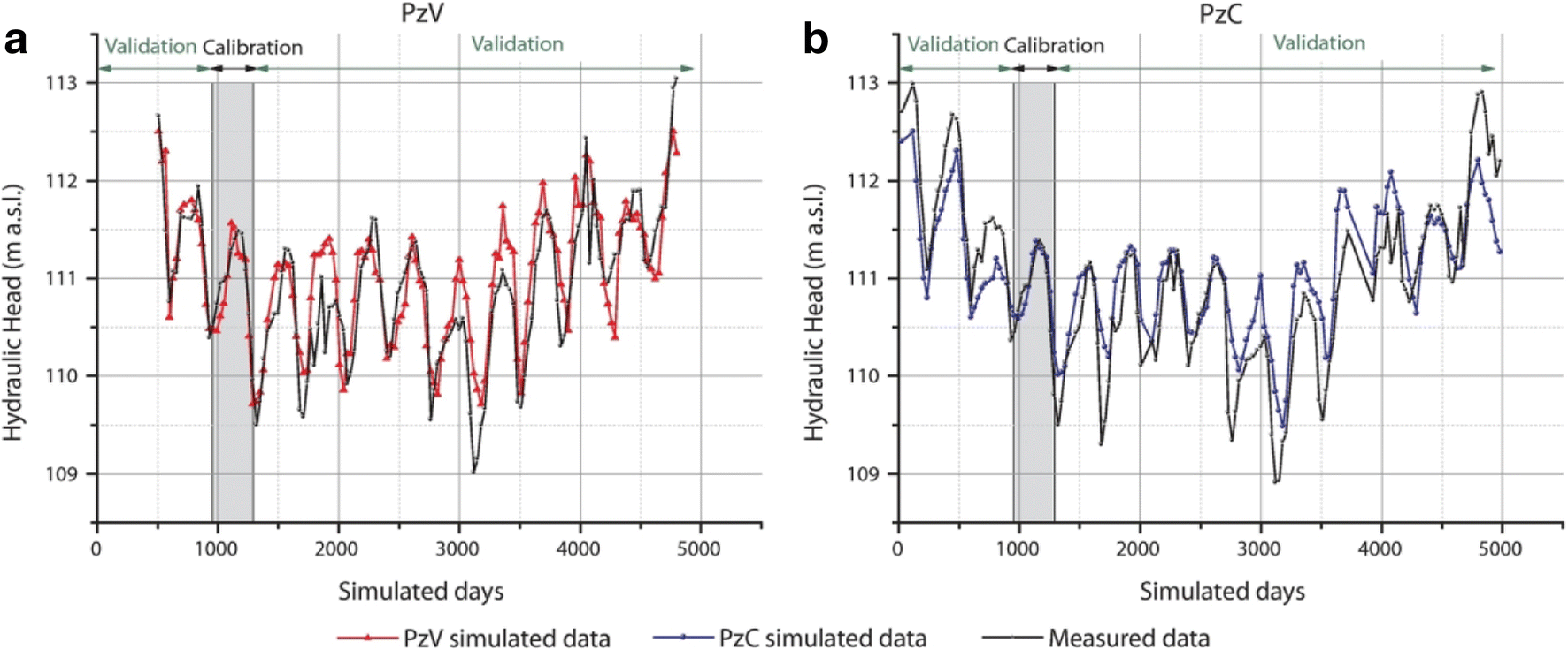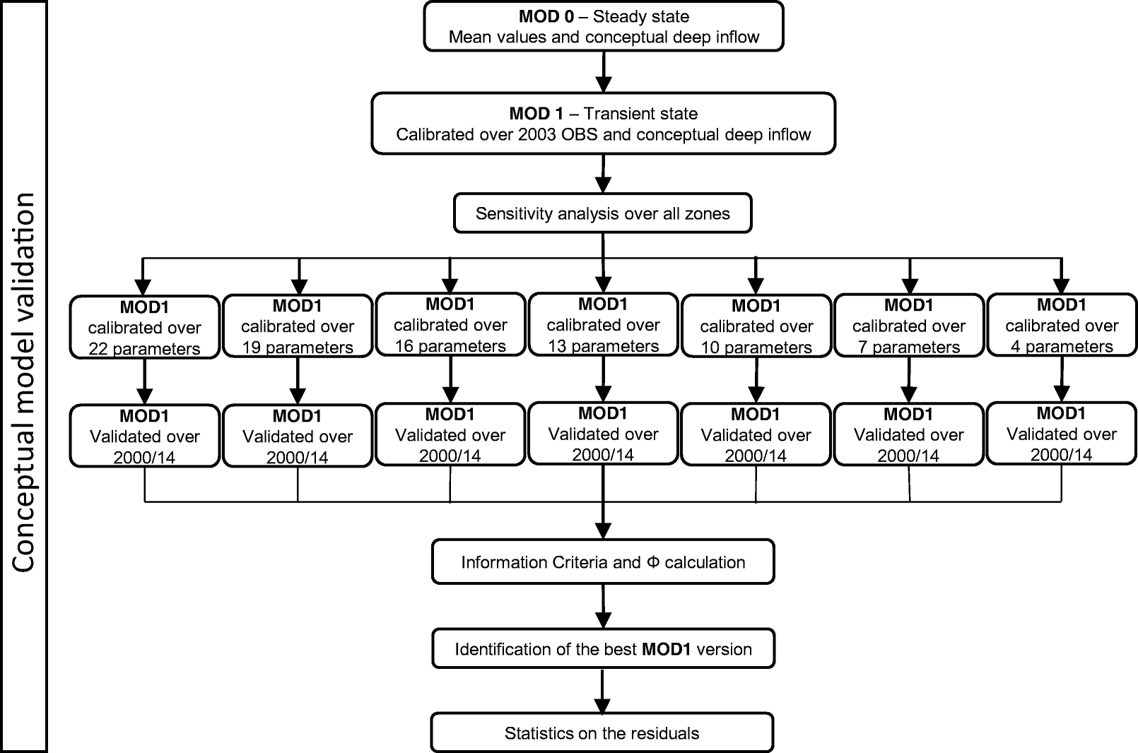 Along with the calibration process, sensitivity analysis was performed. Ranking the parameters according to their sensitivity, simpler versions of the model were calibrated selecting different numbers of parameters with higher sensitivities. After the calibration, the models were validated over the 2000–2014 interval, according to about 360 hydraulic head observations. Residuals, observation sensitivities and information criteria were calculated for each calibration run. Comparison among the different results allowed the ranking of versions of the model drawing more information based on the available data, without overfitting the observations, in accordance with the principle of parsimony.