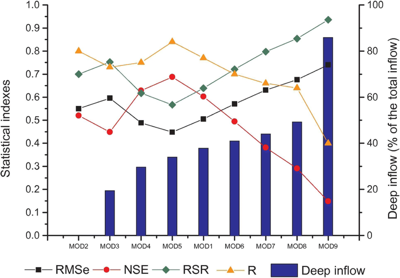 The other model scenarios were characterised by a progressive increase of deep inflow; the statistical results are shown in Fig. 12. The MOD3, MOD4 and MOD5 versions showed an increase of model efficiency up to 0.68 and a decreasing RMSE to 0.45. The MOD6–9 version presents a progressive increase of deep inflow and is characterised by the increase of the model error and a quick decrease in model efficiency. According to the results reported in Fig. 12, it is possible to define the most efficient model scenario (MOD5) corresponding to a deep inflow of around 34% of the total recharge (direct infiltration + deep inflow). The MOD4 and MOD1 versions could also be considered acceptable model scenarios with a percentage of deep inflow ranging between 30 and 38%.
