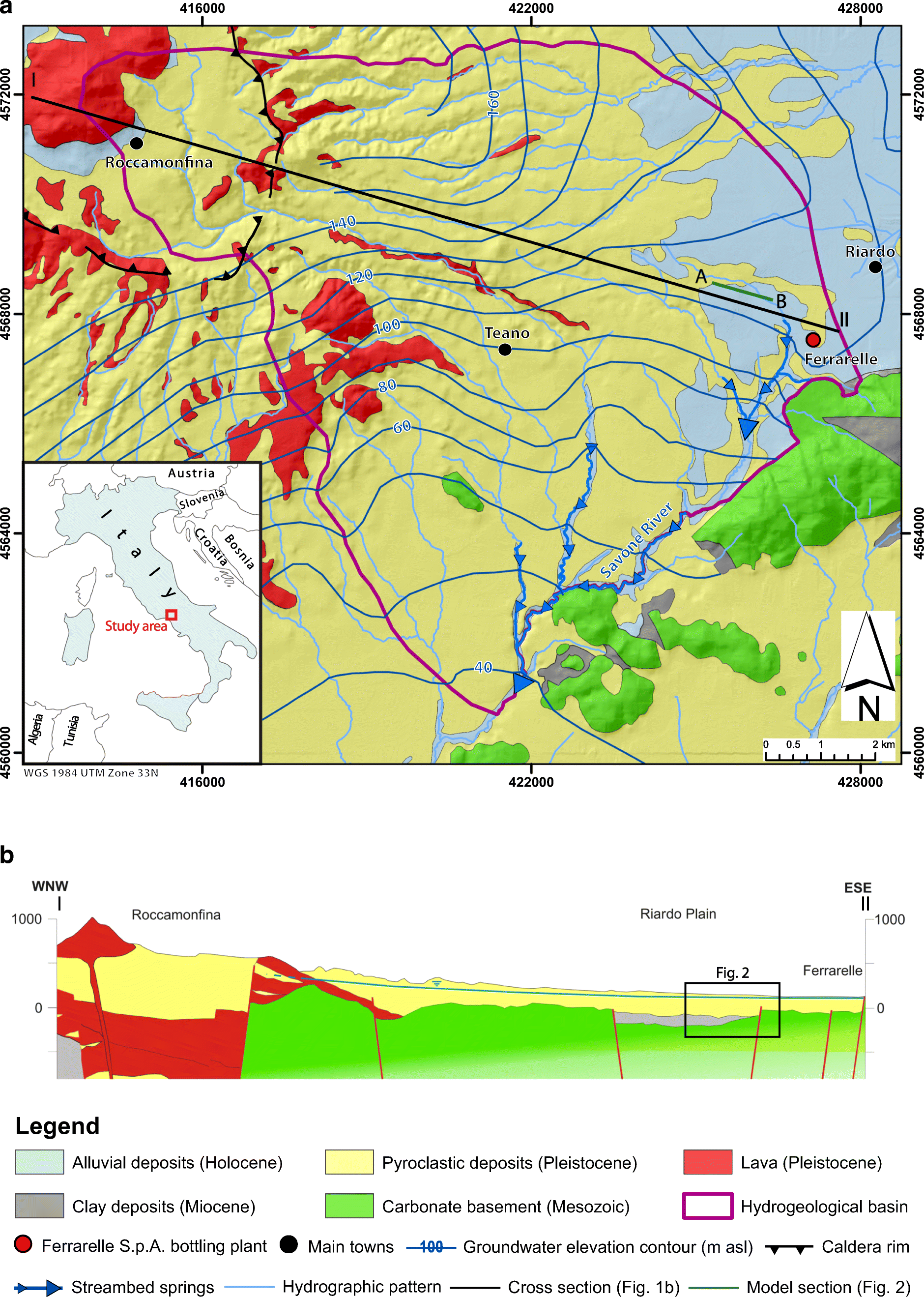 The 2D model focuses on a small but significant section located west of the Ferrarelle S.p.A. mineral bottling plant where it is possible to understand the dynamics, which regulates the aquifer of the Riardo Plain that sources the mineral water. The model section is located in the unique area (Fig. 1) where it is possible to separately distinguish and monitor the volcanic and carbonate aquifer. The carbonate aquifer, covered by the volcanic units, is elsewhere too deep to be exploited or monitored. Furthermore, moving westward, where the carbonate basement upraises due to the tectonic settings, the aquifer dynamics depend on the mixing of the two aquifer layers (Fig. 2).