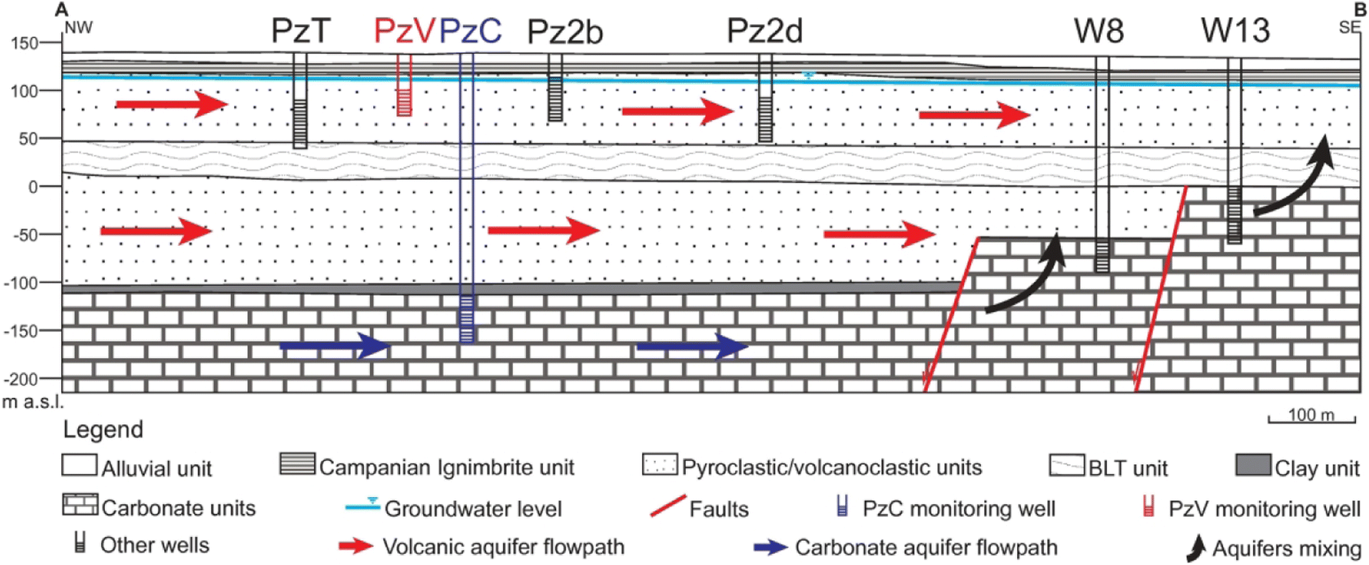 The proposed modelling approach focuses on an area next to the Ferrarelle plant (Fig. 1). The cross section was realised using the available boreholes’ stratigraphic data provided by Ferrarelle S.p.A. The local geological settings agree with the general geological framework previously described (Fig. 1b). The carbonate basement is displaced by faults forming horst and graben. The clay unit is eroded on the horst, which is directly covered by the Roccamonfina volcanic layered deposits filling the structural basin of the Riardo Plain. According to the local geological framework, the two main aquifers have been proved to be locally separated, before mixing together downgradient (Fig. 2).