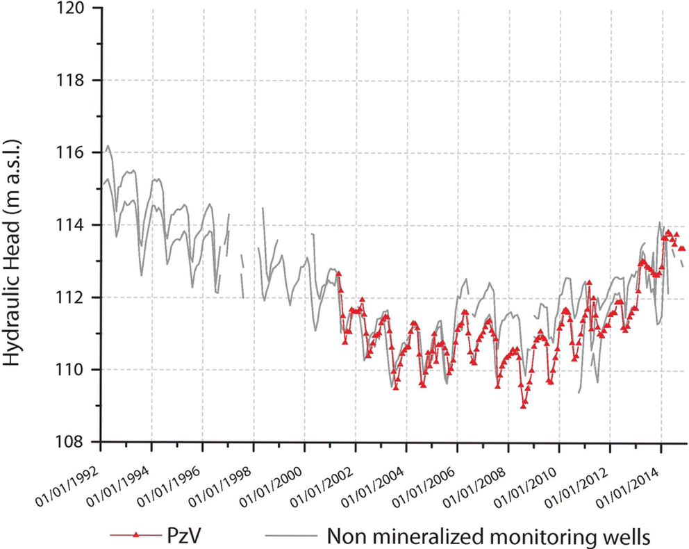 Hydraulic head data collected in well PzV and in other nonmineralised monitoring wells