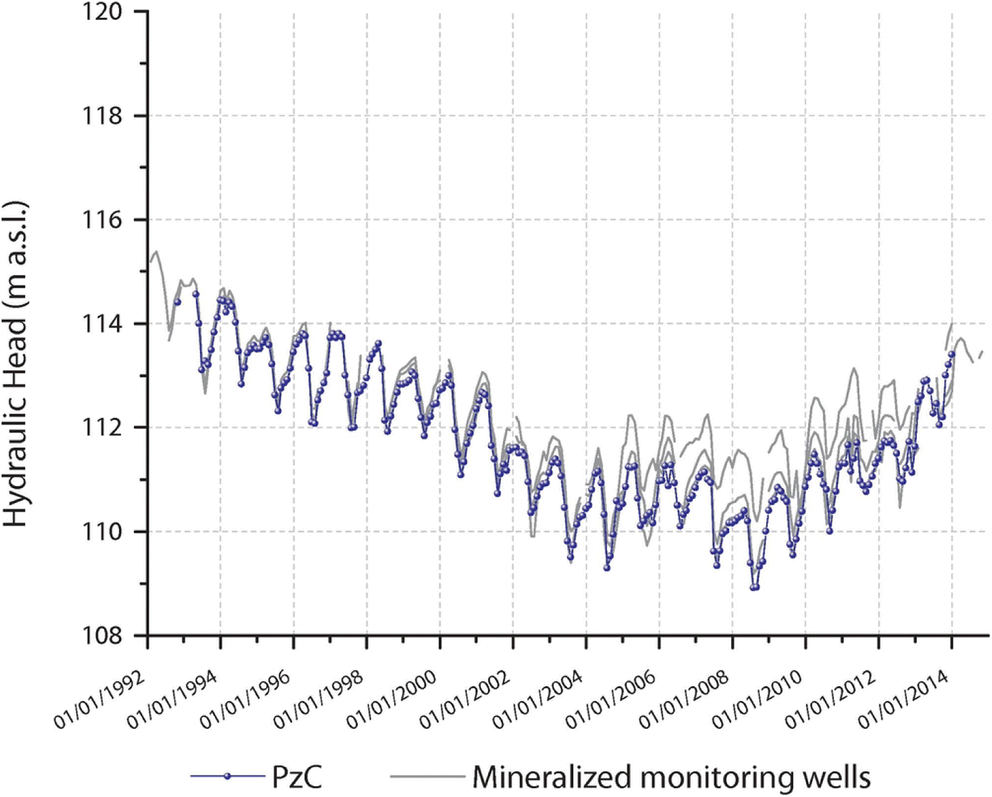 Hydraulic head data collected in well PzC and in other mineralised monitoring wells