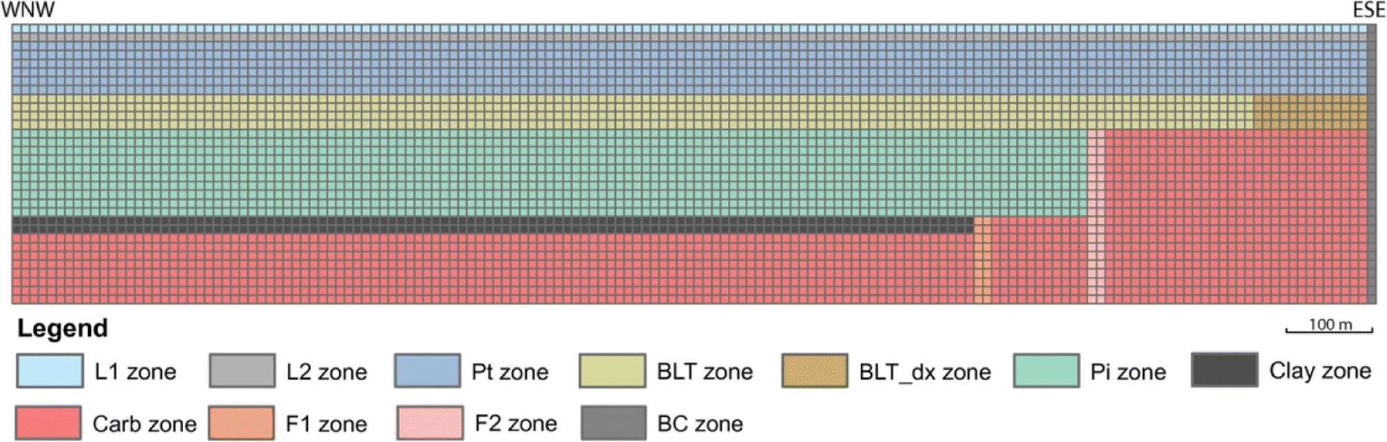 The local geological setting of the modelled area was defined using borehole stratigraphic data provided by Ferrarelle S.p.A. In the eastern section of the model, the limestone basement was detected at an elevation of around 30 m a.s.l., directly covered by volcanic deposits. Moving westward the basement is progressively deepened by extensive tectonic activity. In fact, it was detected at an elevation of around −110 m a.s.l. in the western portion of the model, covered by around 20 m of clay deposits and by 240 m of volcanic deposits (Fig. 5).