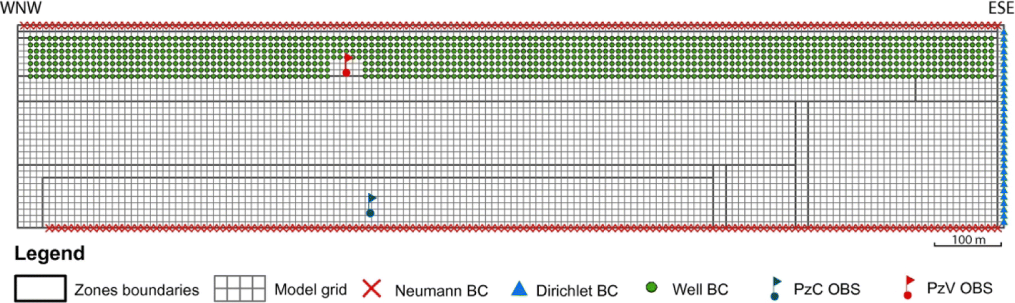 Highly parametrised methods associated with Null-Space Monte Carlo (NSMC) analysis applied to the groundwater modelling (Tonkin and Doherty 2009; Herckenrath et al. 2011; Anderson et al. 2015; Alberti et al. 2018) could provide better insights about the uncertainty associated with the model predictions, enabling the model to fit the observed data with a stochastic distribution of parameters. Nevertheless, given the limited extension of the 2D model domain, its simplified and relatively known geometry, and its vertical dimension, the classical manual regularisation of parameters was performed through hydraulic conductivity zones definition. Without mathematical regularisation used in the highly parametrised approach, NSMC is not applicable.