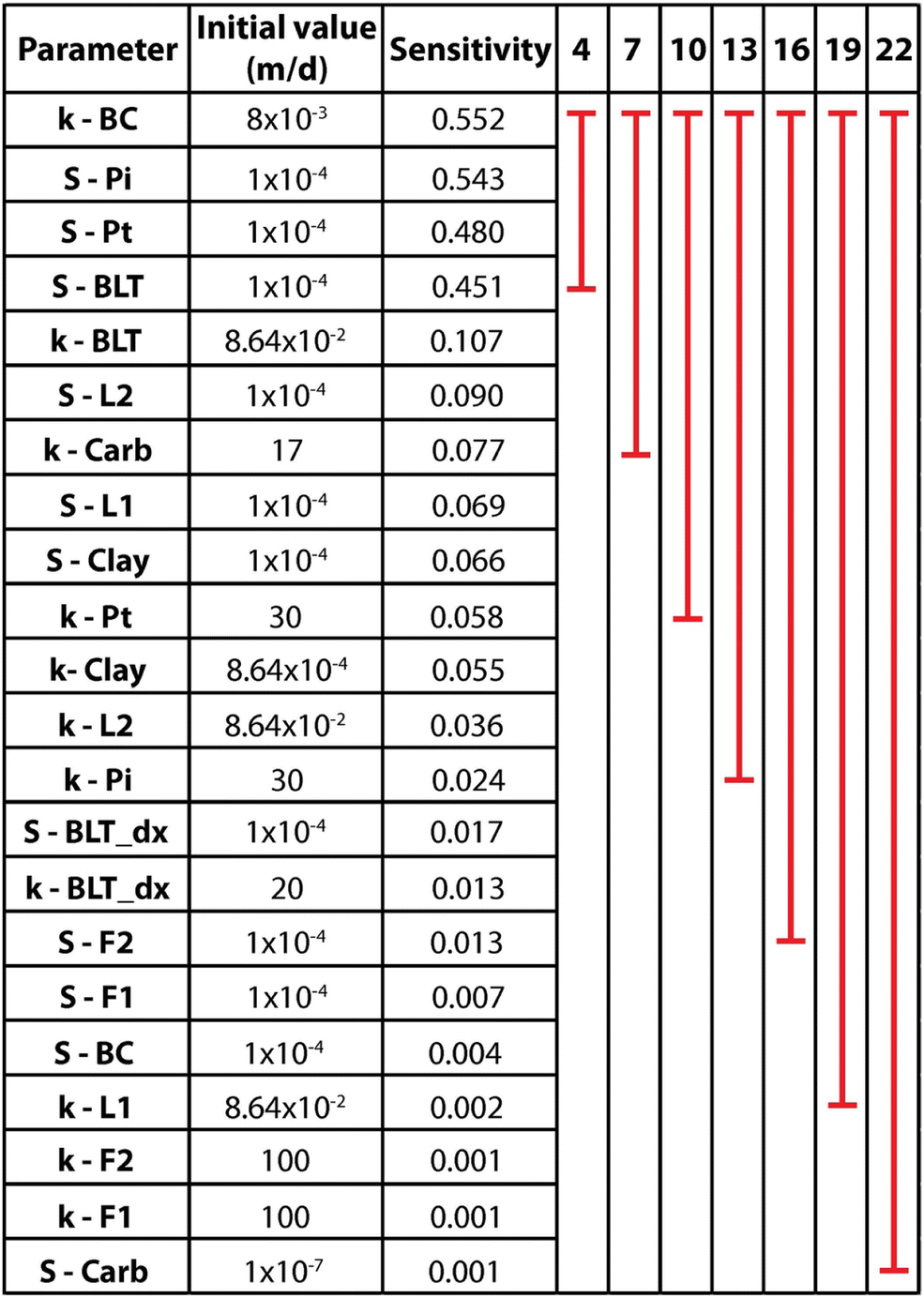 The correlation matrix shows a wide range of positive and negative correlation values between the parameters involved in the calibration. Sometimes the values are close to the autocorrelation (Hill and Tiedeman 2007); therefore, a deep analysis of the eigenvectors and the eigenvalues (all tables in ESM) is necessary as suggested by Doherty (2015).