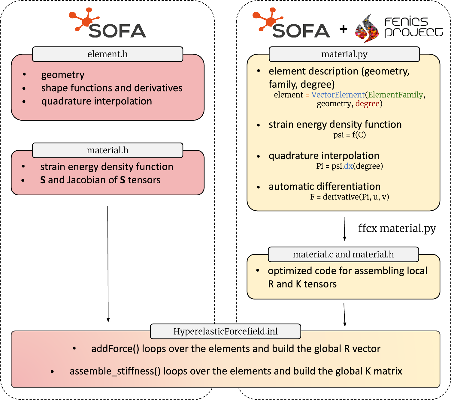 Based on this new implementation, we created a new forcefield HyperelasticForcefield_FEniCS as close as possible to the existing syntax of HyperelasticForcefield. We also needed to tune the existing material definition to replace unnecessary calculations and allow us to read the corresponding.c file.