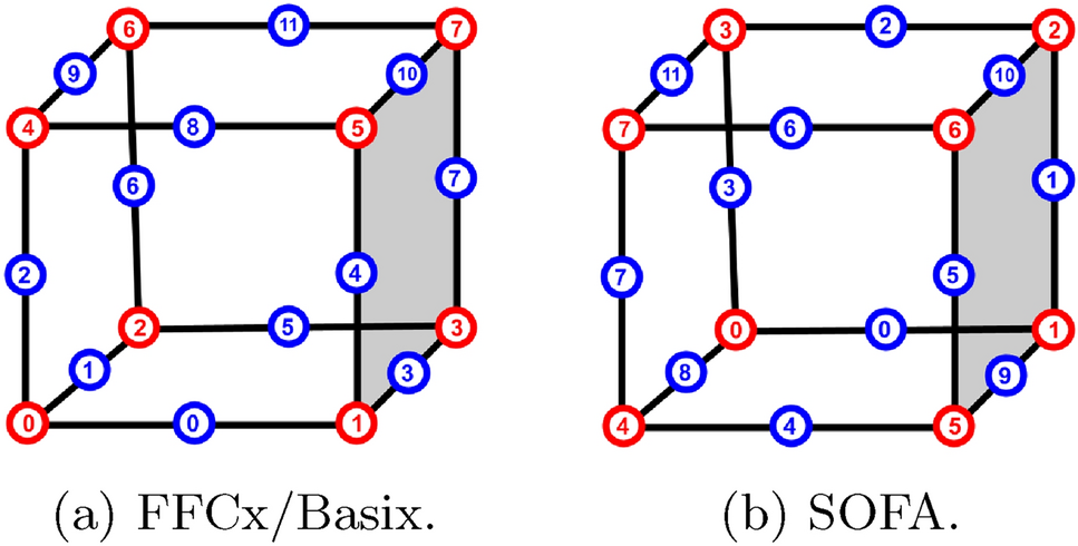 Finally, the last hurdle was the element definitions. Indeed, SOFA and FEniCS do not use the same vertices, edges, and facets ordering (as shown in Fig. 2). To avoid any conflict with the existing users of SOFA and solve the ordering issue, we proposed rearranging the topology indices, edges, and vertices and creating new elements. It ensured an accurate integration over the elements (especially for quadratic Serendipity integrating over the edges) and preserved an appropriate visualization. Those elements have been interfaced with the existing topology named CaribouTopology.