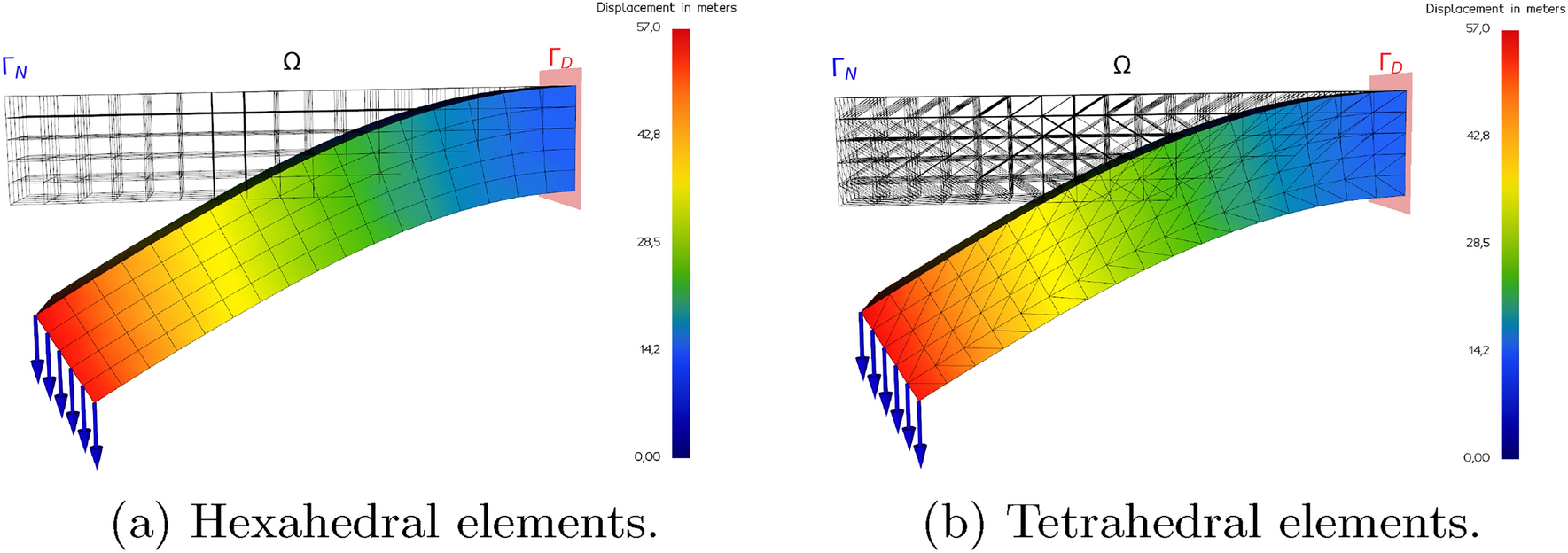 Cantilever beam domain discretization and displacement field. \(\Omega \) is a domain represented by a squared-section beam of dimensions \(80 \times 15 \times 15\,\hbox {m}^3\), considered fixed on the right side (\(\varvec{u}=0\) on \(\Gamma _D\)), while Neumann boundary conditions are applied on the left side (\(\Gamma _N\))