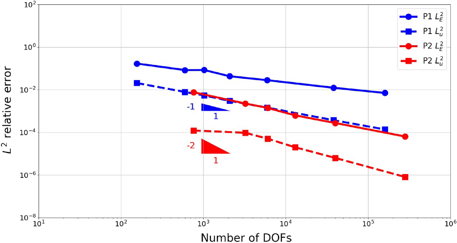 where \(\varvec{u}\) and \(\varvec{v}\) are the calculated displacement vectors for SOniCS and the reference implementation, respectively, \(||\bullet ||\) the Euclidean norm, and \(\varvec{E_u}\) the Green–Lagrange strain tensor of the displacement \(\varvec{u}\).