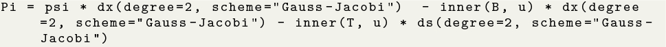 Quadrature rule: In listing 1, at line 37, when calculating the total potential energy, it is also possible to choose the quadrature rule and the degree. In our example, we selected a quadrature degree of 1, triggering by default the Zienkiewicz and Taylor scheme [103] for tetrahedra. Hence, the user could also choose to use a Gauss–Jacobi quadrature of degree 2 [104] by replacing line 37 with: