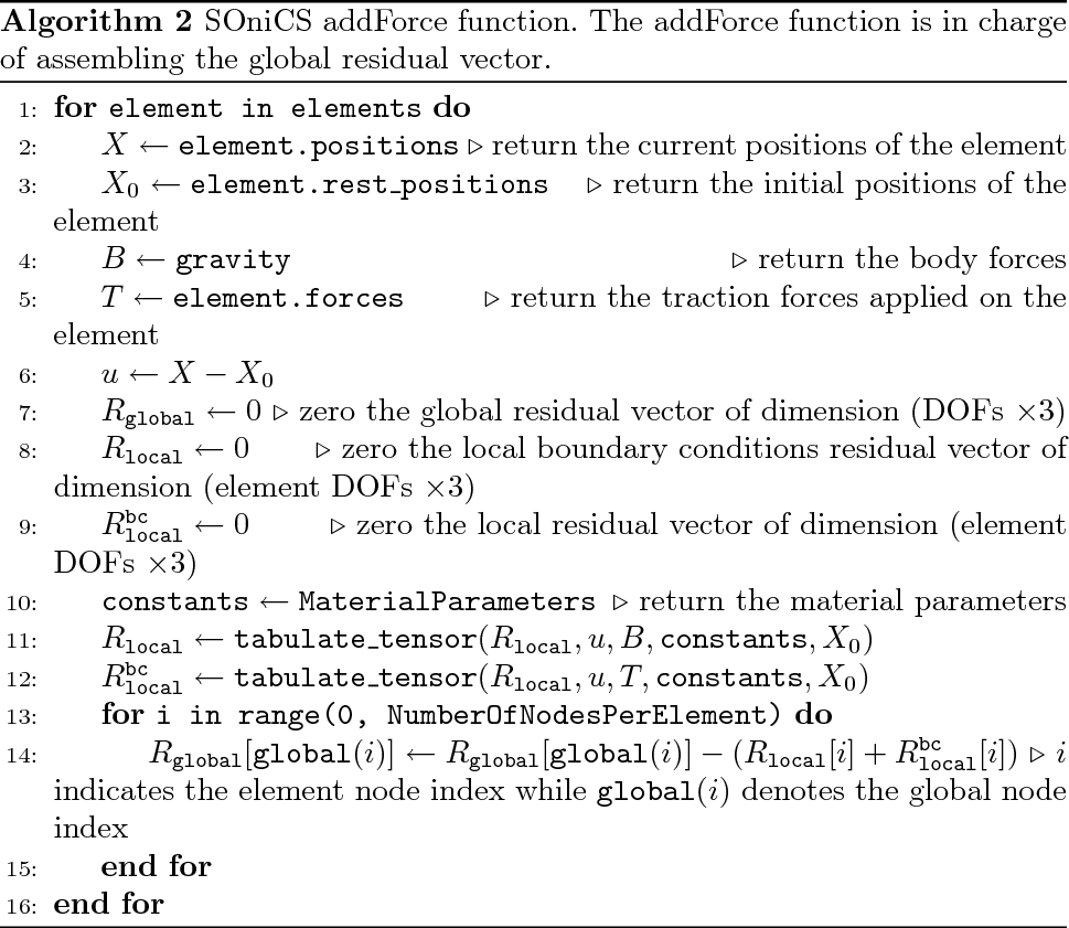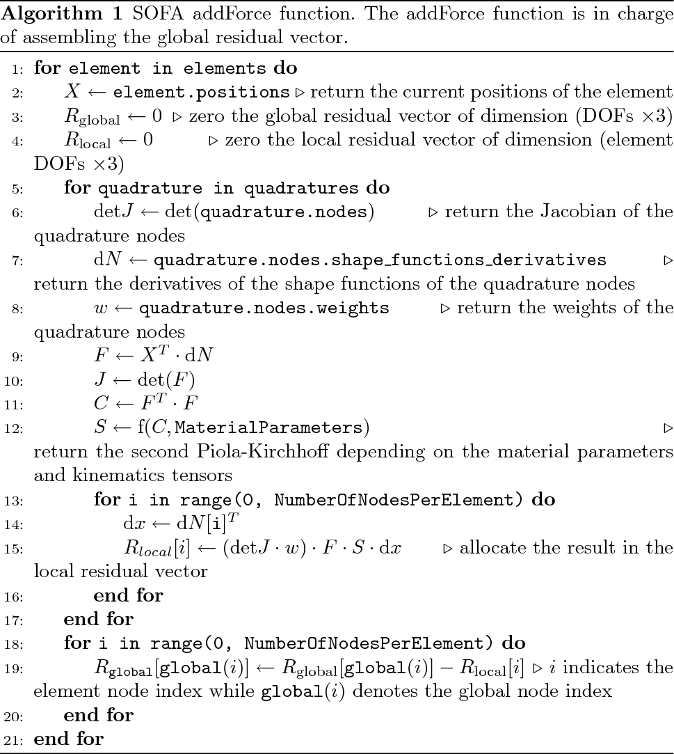 The HyperelasticForcefield.cpp contains several functions, but we are particularly focusing on two of them. The addForce and assemble_stiffness functions are assembling the global residual and stiffness tensors, respectively. Algorithm 1 details the addForce function, while algorithm 2 presents our reimplementation of the procedure. We did not detail the assemble_stiffness as it involves the exact same differences between the two implementations.