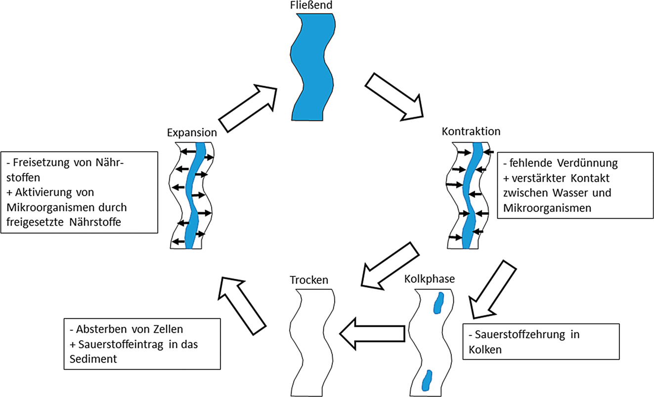 Bei der Austrocknung von Fließgewässern wechseln einander verschiedene hydrologische Phasen ab (Romani et al. 2017; Von Schiller et al. 2017; Abb. 1). Während der Kontraktion kommt es zunächst zu einer deutlich sichtbaren Reduktion der benetzten Oberfläche im Bachbett. In der Kolkphase ist kein zusammenhängender oberirdischer Abfluss mehr erkennbar, tiefere Stellen im Bach sind noch mit Wasser gefüllt. In der Trockenphase ist schließlich das gesamte Bachbett oberirdisch trocken. Je nach den vorherrschenden Umweltbedingungen (u. a. geologischer Untergrund, Hydrologie und Klima) können trockenfallende Bäche alle oder auch nur einzelne Phasen durchlaufen. Ebenso können sich Kontraktion, Kolkphase, Trockenphase und Expansion während einer Trockenperiode mehrmals abwechseln, bevor der Bach wieder in eine längere Fließphase übergeht.