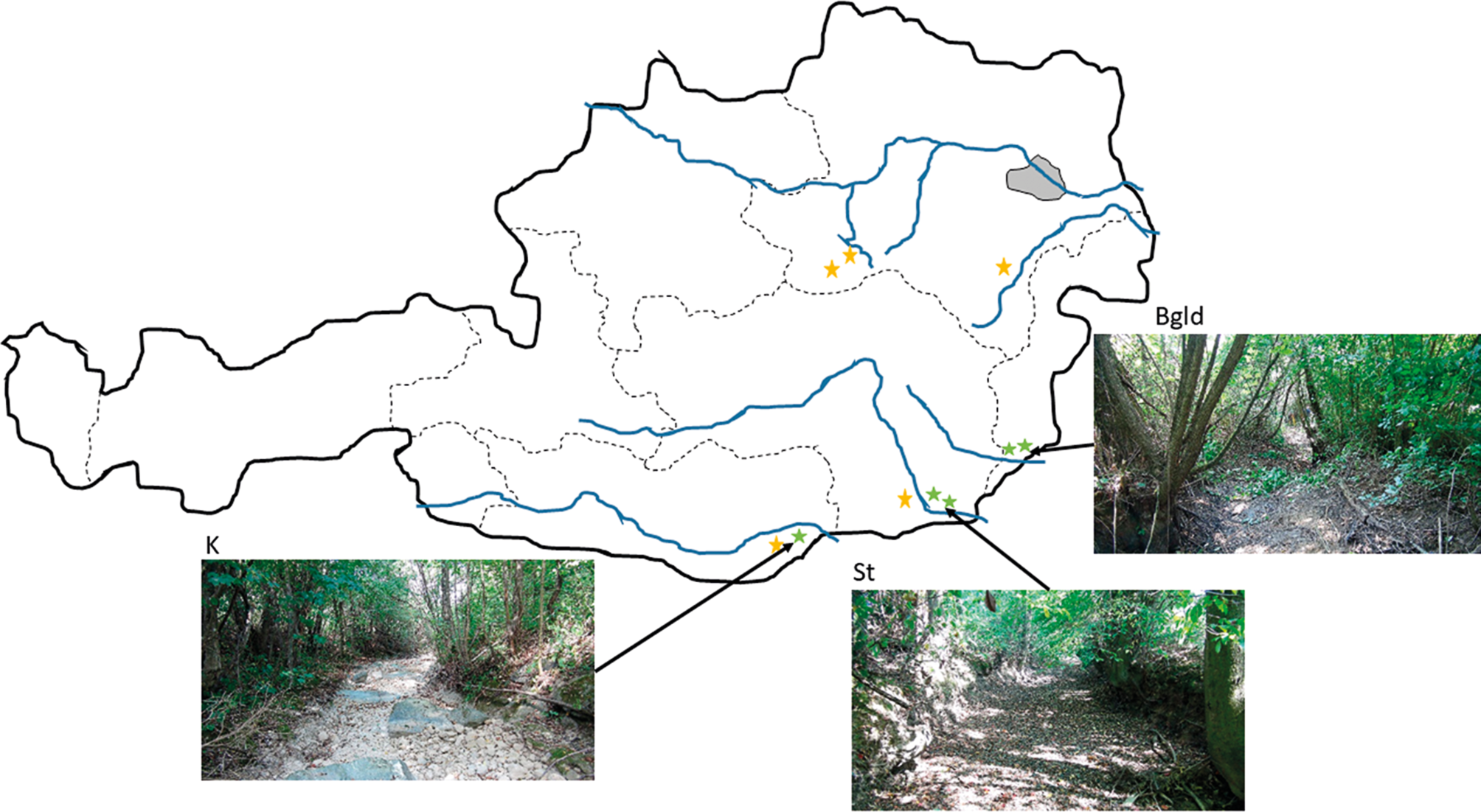 Im ersten Projektjahr wurden jeweils vier Bachabschnitte im Burgenland, zwei in Kärnten und vier in der Steiermark untersucht, wobei die eine Hälfte der Probenstellen in trockenfallenden und die andere Hälfte in permanent wasserführenden Bereichen lag (Abb. 2). In jedem Bundesland wurden die Bäche so ausgewählt, dass sie aufgrund der örtlichen Nähe ähnliche Bedingungen bezüglich geologischem Untergrund, Boden, Hydrologie, Landnutzung und Klima aufwiesen. Alle Strecken zeigten einen mäandrierenden Bachverlauf und wurden beidseitig von Ufergehölz begrenzt. Die Sedimente waren in den burgenländischen und steirischen Bächen durch Feinkies mit einem hohen Anteil an Feinsediment (Ton, Schluff, Sand) und organischem Material charakterisiert. In Kärnten wiesen die Bachabschnitte hauptsächlich grobkiesiges Material auf.