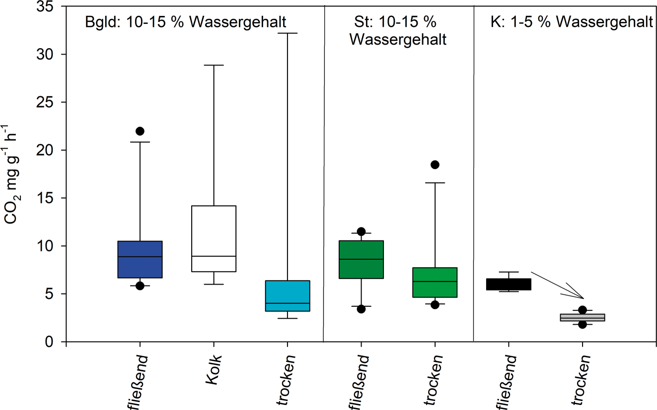 Mikrobielle Atmung, gemessen anhand der CO2-Produktion bei Dunkel-Inkubation, in nassen und trockenen Sedimenten aus perennierenden („fließend“) und intermittierenden („Kolk“, „trocken“) Bachstrecken im Burgenland (Bgld), der Steiermark (St) und Kärnten (K) zwischen Juli und September 2018. Zu sehen sind der Median, die 10-, 25-, 75- und 90-%-Perzentilen und Ausreißer (n = 5–12)