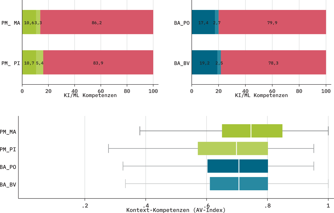 Für beide Bereiche sind diese Angaben zur Häufigkeit der Computernutzung aber nicht hinreichend, um der Frage nachzugehen, die hier verfolgt wird, nämlich: Welche Potenziale sind bei den Beschäftigten vorhanden, um sinnvolle KI/ML-Anwendungen zu implementieren und auf Dauer produktiv nutzbar zu machen? Es geht also um die Frage: kann KI/ML erfolgreich umgesetzt werden oder sind die dafür nötigen KI- und Kontext-Kompetenzen noch nicht bei den Beschäftigten vorhanden. Um dieser Frage nachzugehen werden nachfolgend zwei Kompetenz-Dimensionen betrachtet: