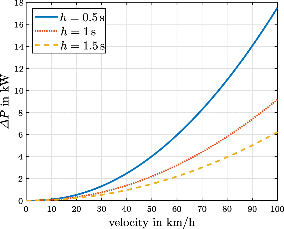 where Pleader is the power of the freely moving lead vehicle and Pfollower is the power of the follower. Figure 1 and Eq. 10 show that the power savings increase with higher velocity v and smaller time headway h. Consequently, for constant velocity a minimal distance policy should be pursued in order to minimise energy consumption of the platoon. However, for non-constant travelling speeds minimal distances might be counter-productive because a lot of energy can be wasted when the acceleration is changing frequently.
