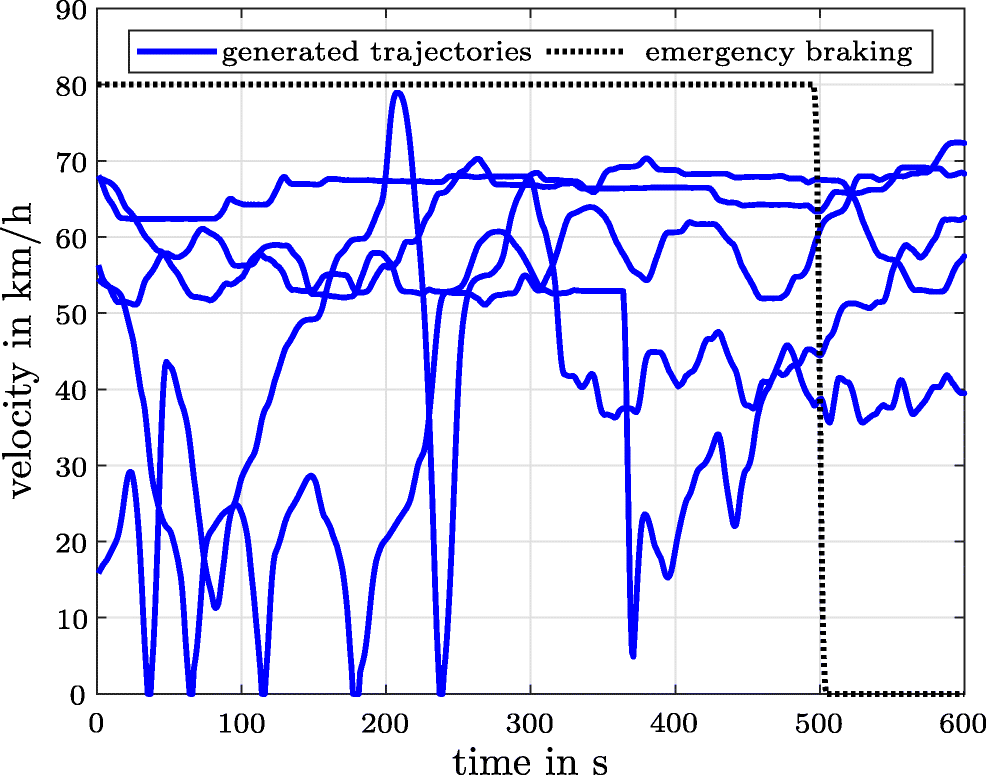 Several uncertainties arise when CACC systems are operated in practice. The most important one is the unpredictable behaviour of the lead vehicle. It is critical that the controller functions in a wide range of possible scenarios. Since the performance criterion (16) is always related to a trajectory of the lead vehicle, the optimisation based on one single trajectory will generally lead to highly specialised results that cannot be applied to a broad range of traffic scenarios. Therefore, the optimisation is rather based on a sample of trajectories which covers many different velocity profiles including extreme events such as emergency braking. Some exemplary, randomly generated trajectories are depicted in Fig. 2. They were created using the algorithm presented in [28], which makes use of modelling conditional probabilities of further accelerating and decelerating given past information, which allows the generation of highly realistic drive cycles. In addition, trajectories with constant cruising speed followed by an emergency braking manoeuvre were added to the sample as well in order to also consider this unlikely, but safety-relevant case. Alternatively, in [29] the authors present a framework that automatically generates platooning scenarios. Such a system or similar could of course also be implemented here. Furthermore, if available, naturalistic driving data can be used instead of generated drive cycles.