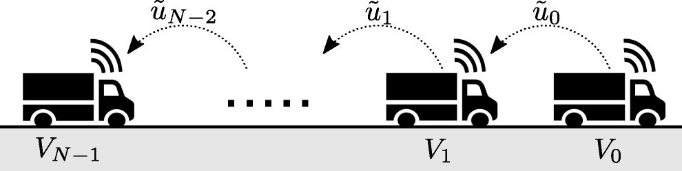 A graphic representation of the platoon is given in Fig. 3. Each of the N vehicles communicates with the vehicle behind itself and transmits its own control input ui. Due to transmission errors or delays a disturbed version \(\tilde {u}_{i}\) is received by the following vehicle. Additionally, each vehicle measures the distance between its predecessor and itself.