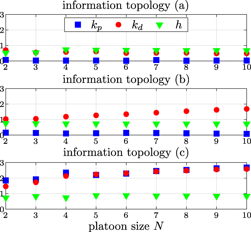 The resulting calibrations \(u_{a}^{*}\), \(u_{b}^{*}\) and \(u_{c}^{*}\), depending on the platoon size N, are presented in Fig. 4. Additionally, the actual controller values for a platoon consisting of N = 5 vehicles are listed in Table 1. As expected, the time headway h increases with worse communication. Simultaneously, the controller gains kp and kd increase. This reflects the fact that the controller needs to react more aggressively to the measured distance errors and their derivatives when no or only delayed feed-forward information about the front vehicle’s control input is available. In the case of perfect information, kp is almost zero, indicating that the position measurement is basically not used. The impact of the platoon size on the optimal calibration is much smaller than the influence of the information flow topology. With perfect information, the size of the platoon is practically irrelevant for the calibration, as can be seen in Fig. 4. For non-perfect information, larger platoon sizes imply slightly increased optimal time headways h. The controller parameters kp and kd also increase. The differences in the optimal calibration are most significant for information topology (c), where there is no information and the controller has to rely on measurements exclusively. The controller becomes slightly more aggressive for larger platoons.