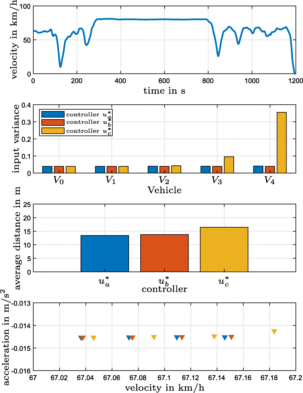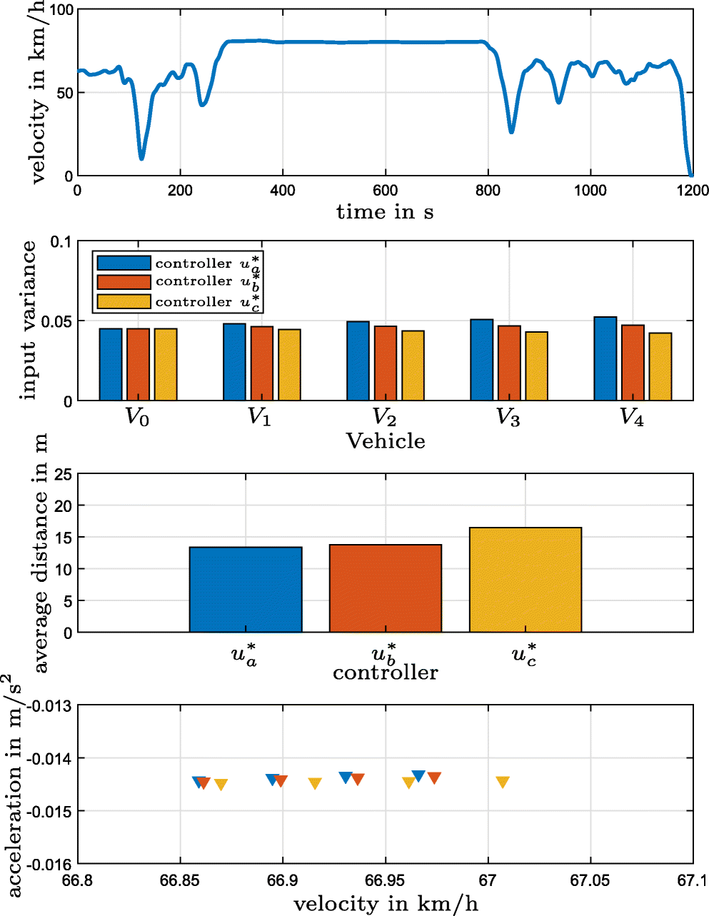 In Fig. 5, one of the cycles used in the validation presented in Table 2 is analysed in more detail. The platoon consisting of five vehicles was simulated using model (1), which was also used for the design and optimisation of the controllers given in Table 1. The lead vehicle follows the defined velocity trajectory and the other platoon members follow. The simulation was executed with an information transfer delay of 0.5 s. The controller input variance over the entire drive cycle is almost equal for all vehicles of the platoon and also for the three different controllers. This implies that there are no increasing oscillations in the platoon. The main difference can be seen in the average distance, where controller \(u_{a}^{*}\) implies significantly smaller distances than \(u_{c}^{*}\), which is a consequence of the different desired time headways (see Table 1). Average velocity and acceleration are also fairly similar among all vehicles and controllers. Furthermore, during the simulations no collision occurred in any of the three cases. These results indicate that all three controllers work reasonably well in the simulated setting.