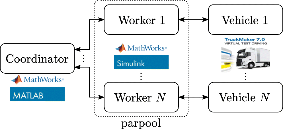 The results presented in Sections 3.1 and 3.2 were all obtained using the simple linear vehicle model (1). Also the controller structure itself was derived from that model. Consequently, it is not surprising that the simulation used in Table 2 and Fig. 5 shows satisfying results. However, this unfortunately does not guarantee the same performance under real driving conditions with real vehicles, whose powertrain and internal dynamics differ from the simplistic model (1). Since expensive and time-consuming real world tests are often not feasible in early development stages, an alternative approach is to use more elaborate vehicle dynamics simulations instead. One possible solution is provided by the commercial software IPG Truckmaker®;. It provides very detailed simulation models for single heavy duty vehicles. The simulation of entire platoons can be realised by running multiple instances of Truckmaker®;, one for each platoon member, simultaneously, as in [24]. The utilised simulation framework is illustrated in Fig. 6. The coordination of the platoon is governed by a central Matlab®; session which communicates with the individual vehicles using the Truckmaker®; for Simulink interface. The respective control actions are calculated in the Coordinator-Matlab®; session and distributed to the respective parallel Truckmaker®; instances.