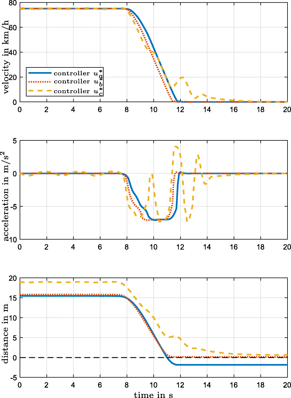 The oscillations of the control inputs increase with every vehicle in the platoon leading to strong oscillations in the last platoon member. The average distances are virtually the same as in Fig. 5, though. In the bottom panel of Fig. 7 one can see how the average acceleration per vehicle is more or less constant for the different vehicles for the first two controllers. However, for the third controller \(u_{c}^{*}\) the average acceleration varies among the vehicles. The reason for the bad performance of the third controller are the large gains in \(u_{c}^{*}\). The vehicle strongly reacts to distance measurements but the vehicle now behaves differently than assumed in the derivation of the controller because of the more detailed non-linear simulation model. In this situation the controller gains are too large and induce oscillations. The other two controllers show satisfying performance also in the high fidelity simulation. In fact, the results of both the simple and elaborate simulation look almost identical. None of the three controllers lead to a collision within the platoon in this test scenario.