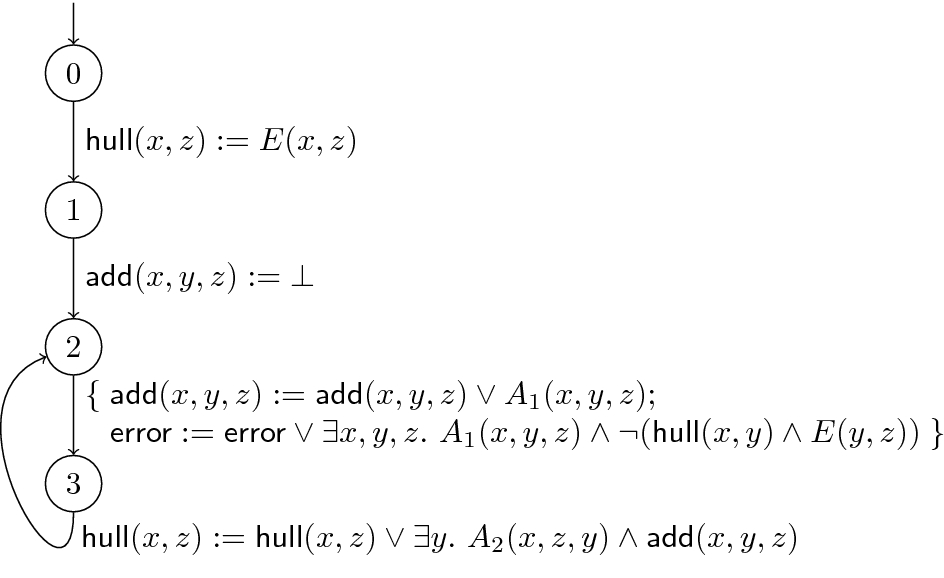 For the required SO quantifier elimination of \(A_1,A_2\), we note that in order to avoid \(\textsf {error}\) to be set to \(\top \), \(\textsf {add}(x,y,z)\) must imply \(\textsf {hull}(x,y)\wedge E(y,z)\). In order to falsify the invariant at program point 1 whenever possible, thus, \(A_1(x,y,z)\) should be set to \(\textsf {hull}(x,y)\wedge E(y,z)\), and \(A_2(x,z,y)\) at least to \(\textsf {add}(x,y,z)\). For the iterates \(\Psi ^{(h)}\) at program point 2, we therefore obtain