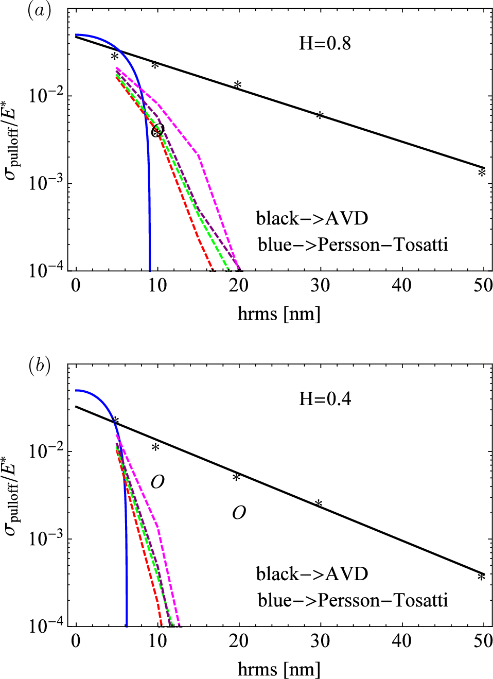 Moving to the results in Fig. 5 in [2] which report the pull-off should decay \(\frac{\sigma _{\text{pulloff}}}{E^{*}}\) with magnification \(\zeta\) for \(h_{\text{rms}}=20\,{\text{nm}}\), Fig. 2 shows their results as black solid line for \(H=0.8\) (a) \(H=0.4\) (b) as "AVD." To avoid confusion, we report separately the case of \(H=0.8\) (Fig. 3a), and \(H=0.4\) (Fig. 3b). Once again, we find the 1D rough profiles are much more sticky than the isotropic counterpart, so we don’t show in the figure the Persson–Tosatti prediction for the correct roughness amplitude, which would have no pull-off value at all. Instead, we report much smaller rms amplitudes for comparative purposes, namely to evaluate if the expected trend with magnification is correctly predicted, since this is one of the main points raised by [2], and by the debate about low vs high fractal dimension.