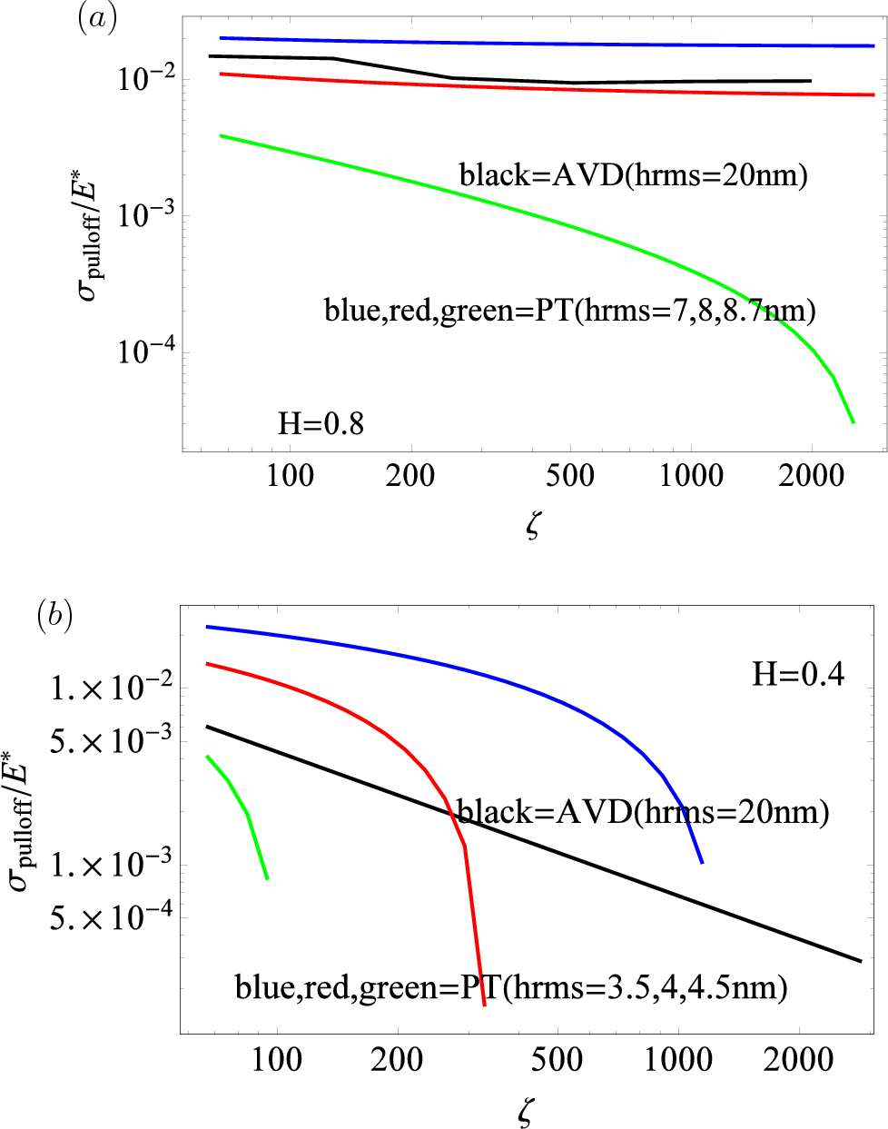 Pull-off should decay \(\frac{\sigma _{\text{pulloff}}}{E^{*}}\) with magnification \(\zeta\) for \(h_{\text{rms}}=20\,{\text{nm}}\) in the Fig. 5 case of [2] (black solid line for \(H=0.8\) (a) \(H=0.4\) (b)). Color lines are the Persson–Tosatti predictions for isotropic PSD roughness (4) for \(h_{\text{rms}}=7,8,8.7\,{\text{nm}}\) (a) and \(3.5,4,4.5\,{\text{nm}}\) (b) (Color figure online)